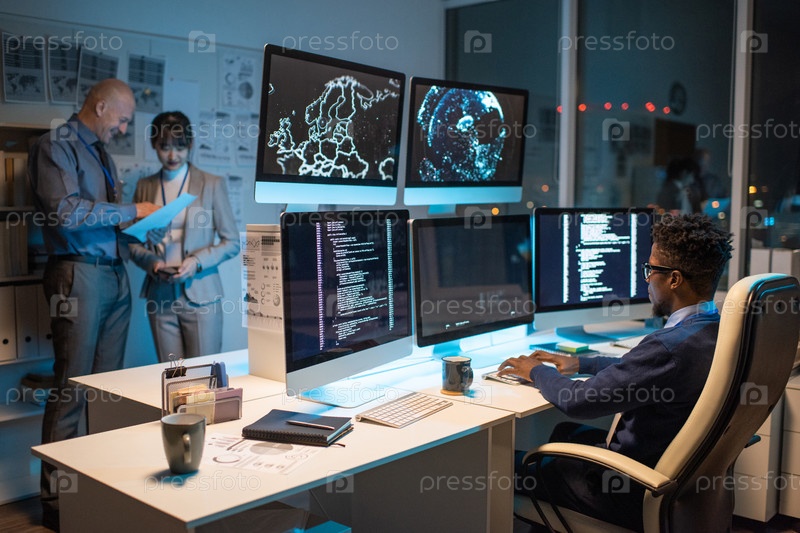 Молодой африканский бизнесмен смотрит на данные на экране компьютера