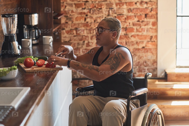 Женщина в инвалидном кресле готовит еду дома