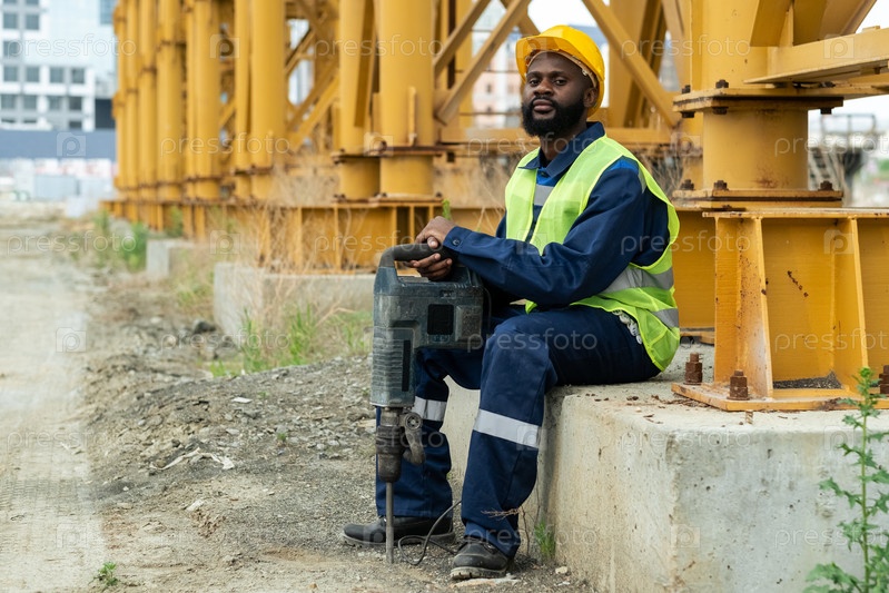 Строительный работник с рабочим инструментом на открытом воздухе