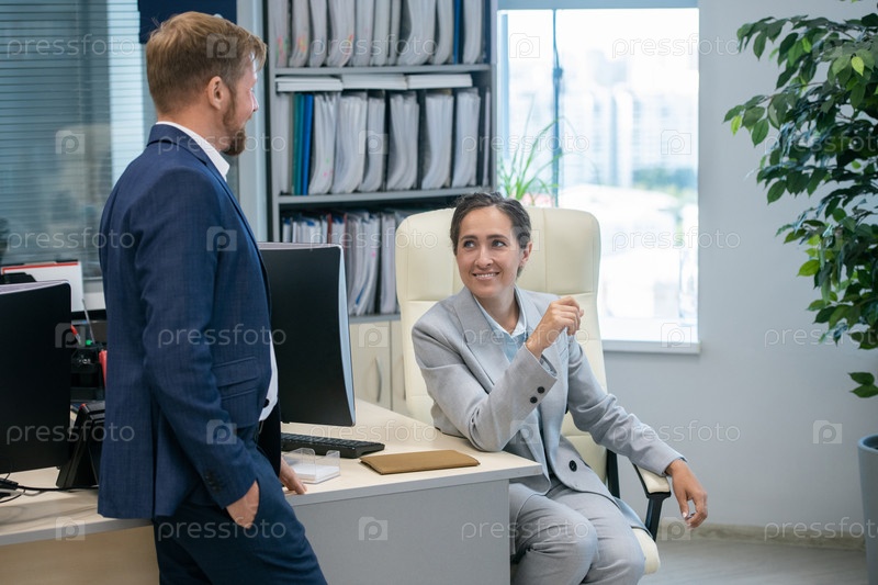 Счастливая молодая бизнес-леди и бизнесмен ведут дискуссию