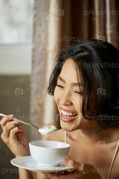 Женщина ест мюсли с йогуртом
