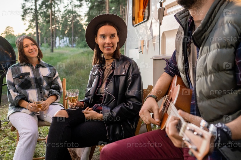 Две счастливые девушки с напитками слушают молодого человека, играющего на гитаре