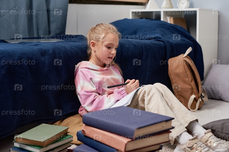 Блондинка в капюшоне с абстрактным узором сидит на кровати и читает записки, готовясь к школьному тесту