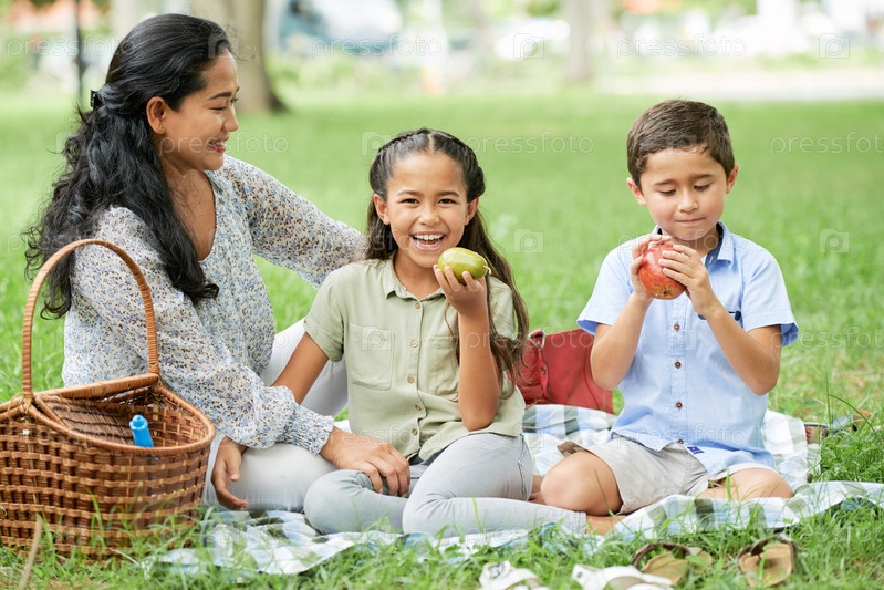 Мать с детьми сидит на пикнике