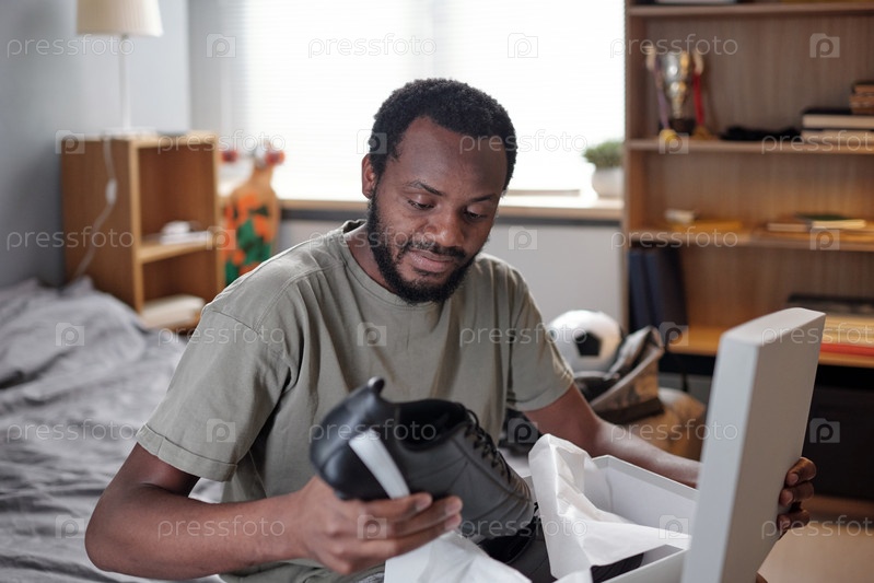 Африканский спортсмен распаковывает коробку с новыми черными спортивными ботинками
