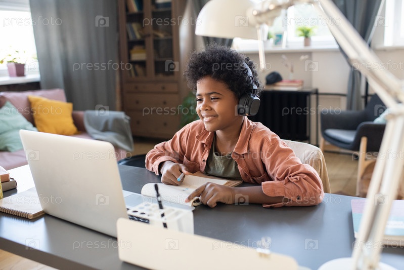 Улыбающийся школьник смотрит на экран ноутбука, слушая учителя