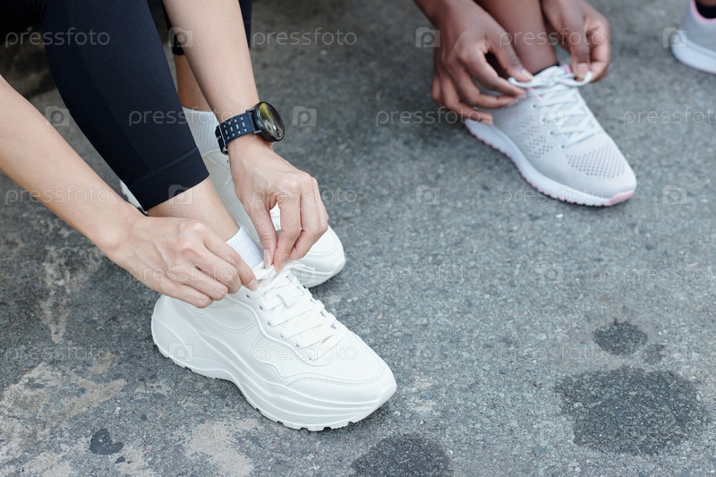 Женщины-спортсмены, завязывающие шнурки