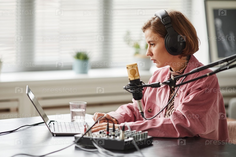Молодая женщина записывает подкаст Side View