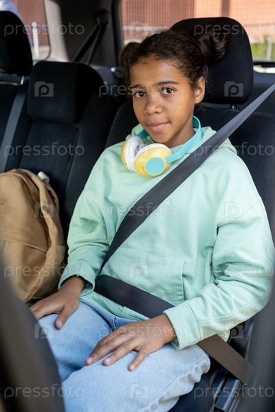 Милая школьница смешанной расы, сидящая на заднем сиденье машины