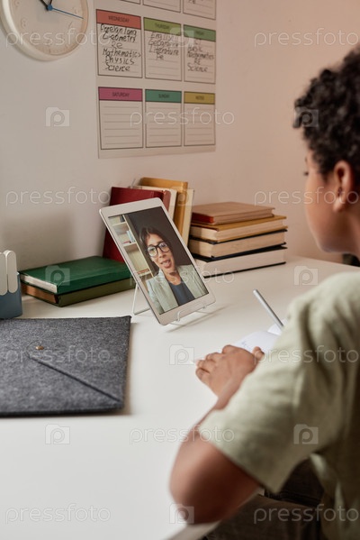 Вид на плечо черного мальчика, сидящего за столом и использующего планшет во время работы с веб-репетитором