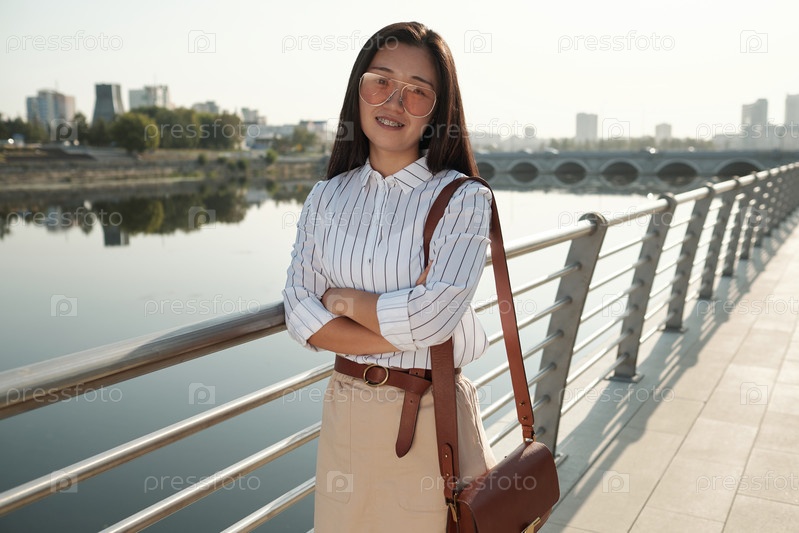 Молодая китайская бизнесвуменка стоит на берегу реки