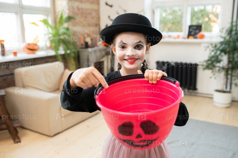 Очаровательная девушка в костюме Хэллоуина, указывающая на пустую ведро для сладостей