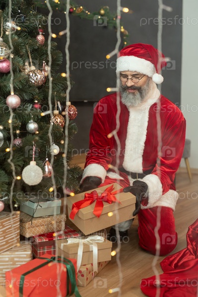 Бородатый Санта выбирает подарок под деревом
