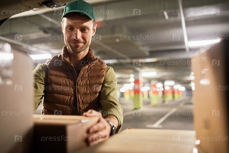 Улыбающийся рабочий доставки загружает фургон