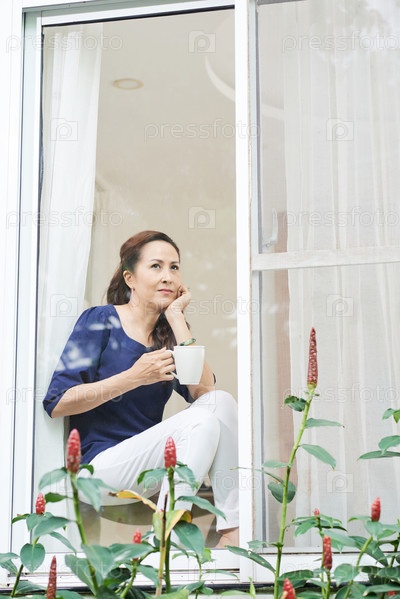 Пенсивная женщина пьет кофе