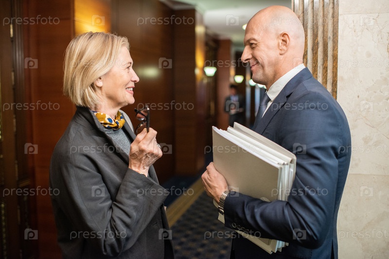Две элегантные зрелые коллеги, взаимодействующие в коридоре