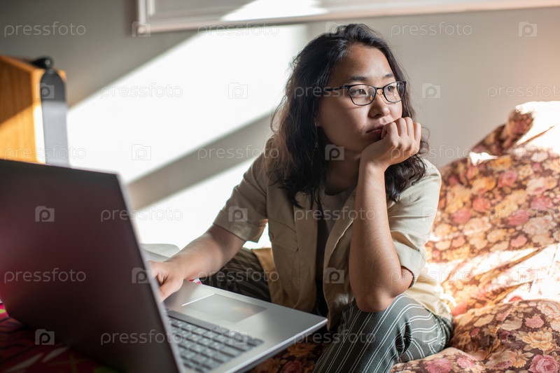 Молодая отвлеченная женщина, сидящая перед ноутбуком