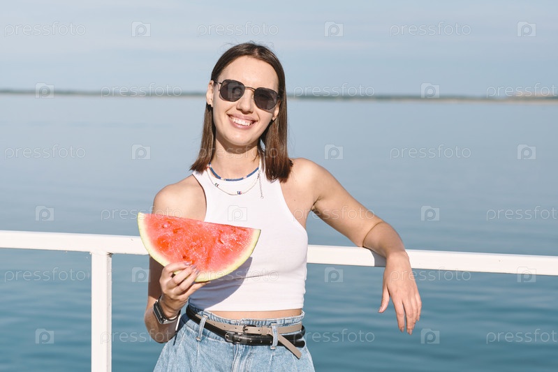 Красивая женщина в солнцезащитных очках, держащая большой кусок арбуза
