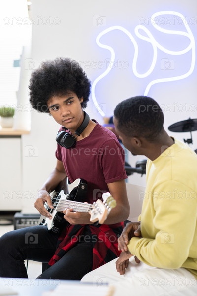 Усердный парень смотрит на своего учителя музыки, играя на гитаре