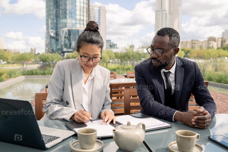 Два молодых элегантных деловых партнера сидят за столом, в то время как один из них подписывает контракт