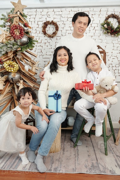 Улыбающаяся семья на рождественской елке