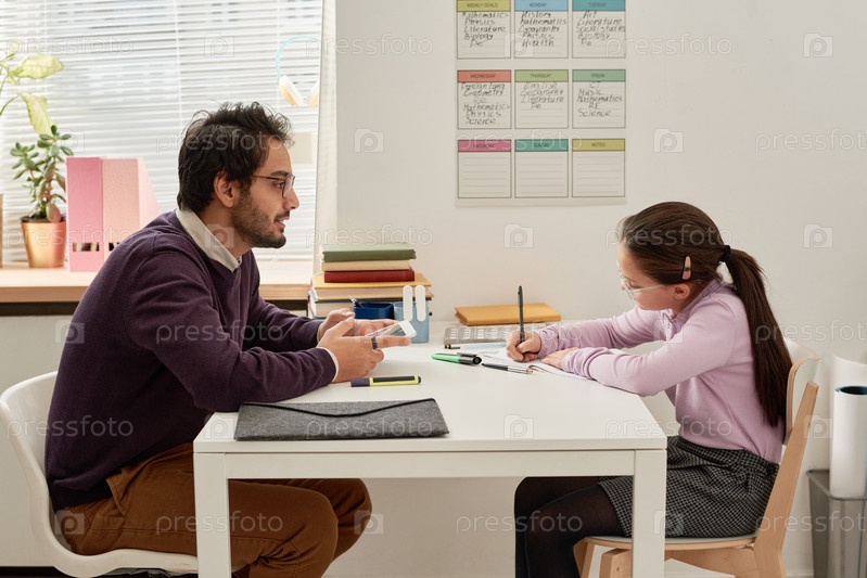 Репетитор смешанной расы с бородой сидит за столом в детской и объясняет правила девочке