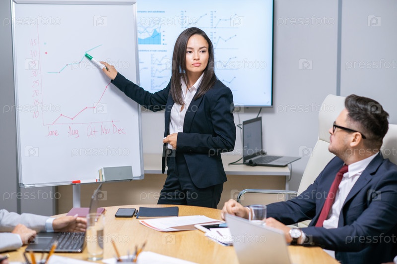 Уверенная в себе деловая женщина, указывающая на финансовый график на доске