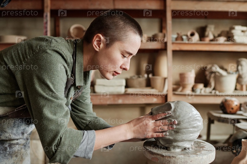 Женщина делает человеческое лицо из глины