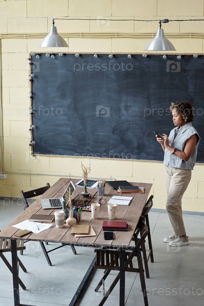 Современная молодая бизнес-женщина прокручивает в мобильном телефоне
