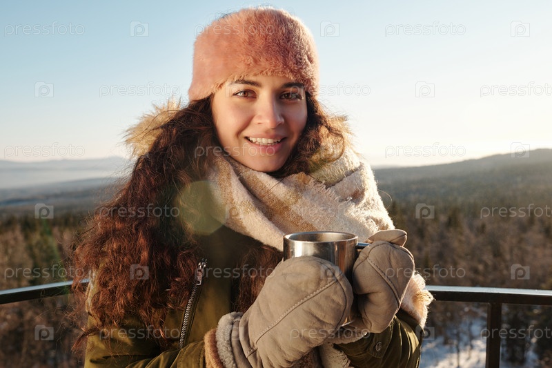 Молодая женщина пьет горячий чай на красивом ландшафте в зимний день