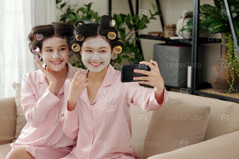Joyful Girls Taking Selfie с глиняной маской на голове