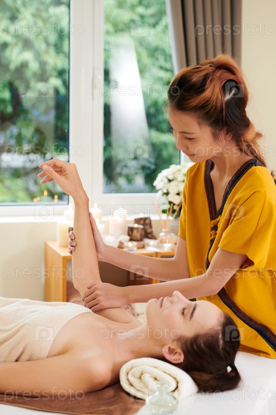 Терапевт массажирует молодую женщину
