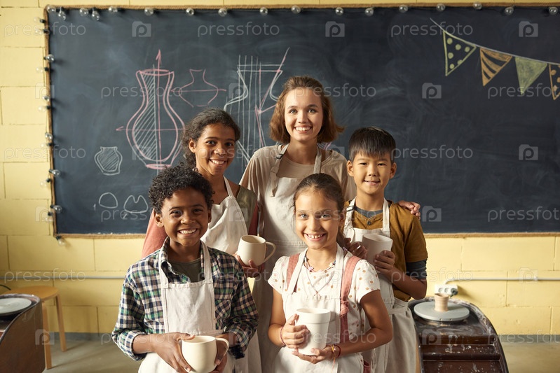 Группа межкультурных школьников и их учительница по ремеслам