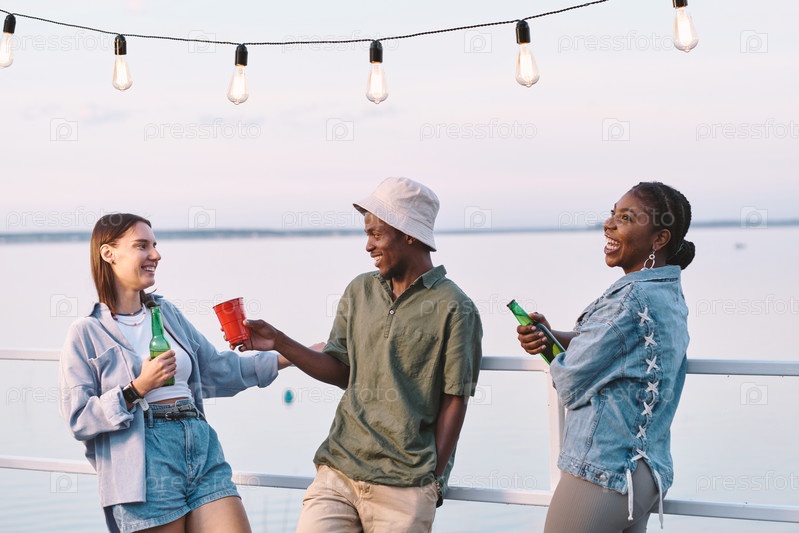 Группа молодых многорасовых друзей с выпивкой весело проводит время