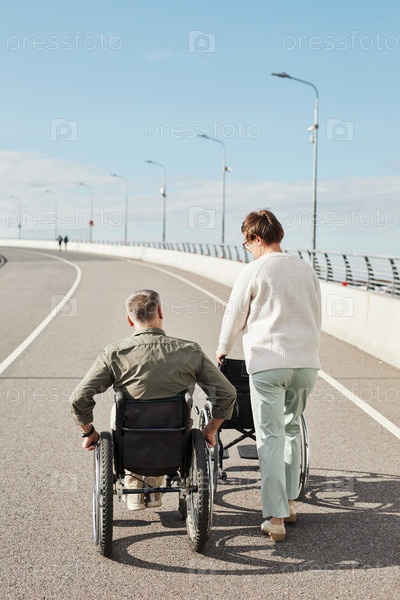 Пара с мужчиной в инвалидной коляске Задним видом