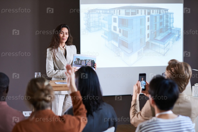 Деловая женщина, представляющая современное здание на семинаре