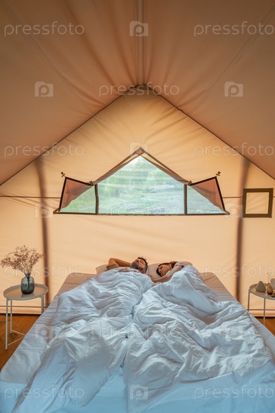 Молодая пара спит под белым одеялом на двухместной кровати