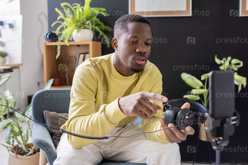 Молодой африканский мужчина с наушниками в руке дает мастер-класс