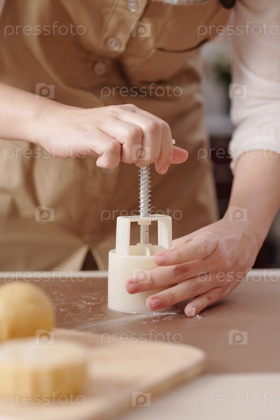 Женщина, использующая пластиковый инструмент при изготовлении торта