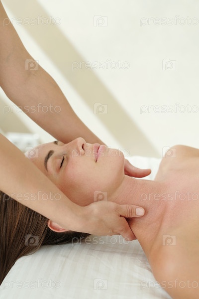 Молодая женщина наслаждается массажем шеи, который делает ее массажистка