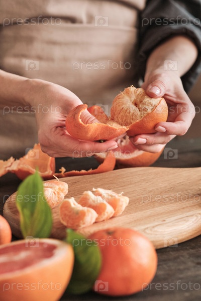 Непризнанная женщина очищает мандаринку над доской