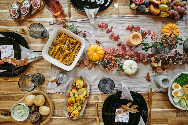 Часть подаваемого праздничного стола с декорациями и домашней едой