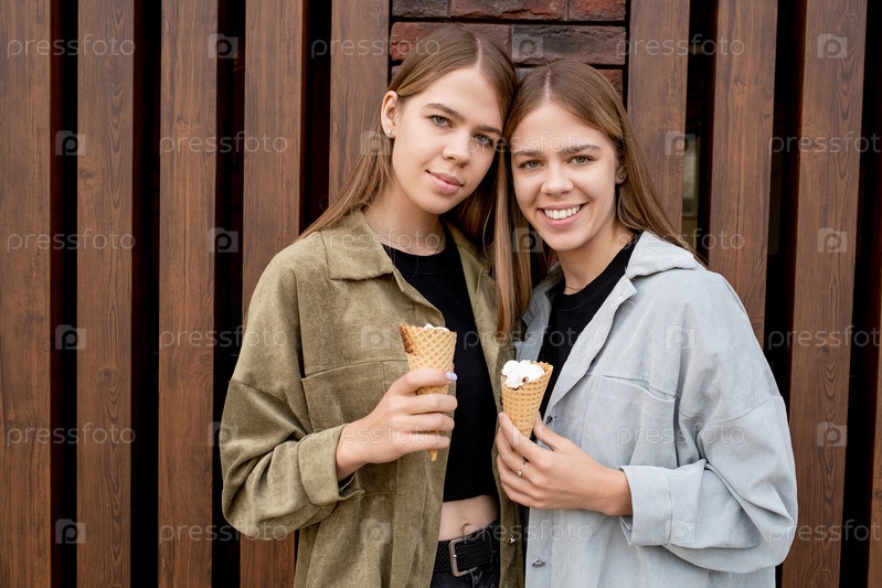 Две красивые девушки с мороженым, стоящие на деревянной стене