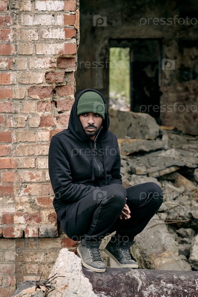 Молодой одинокий мужчина в повседневной одежде сидит на руинах