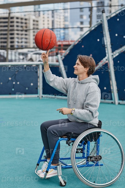Женщина в инвалидном кресле играет в баскетбол