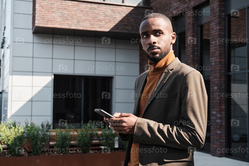 Офисный работник со смартфоном, который смотрит в сторону