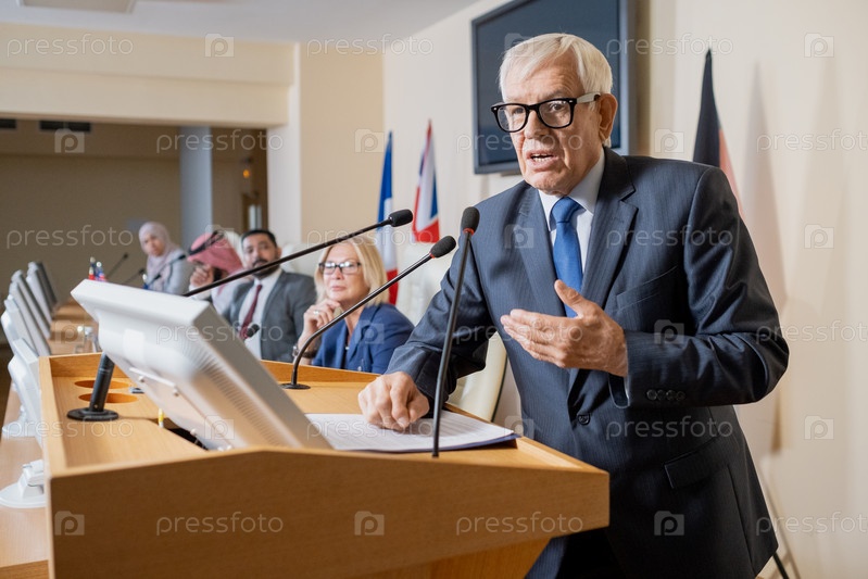 Уверенный зрелый делегат, говорящий на трибуне, стоя перед аудиторией