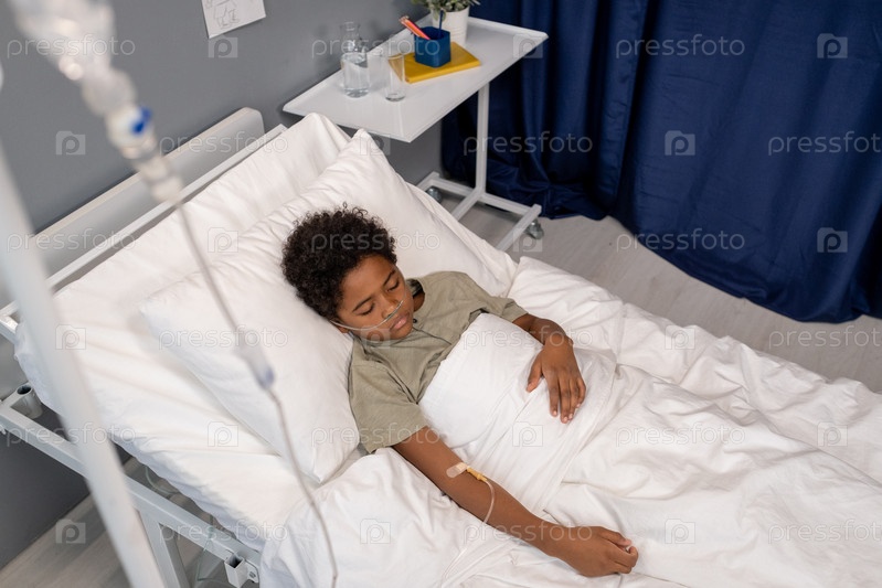 Больной мальчик лежит на кровати в больничном отделении
