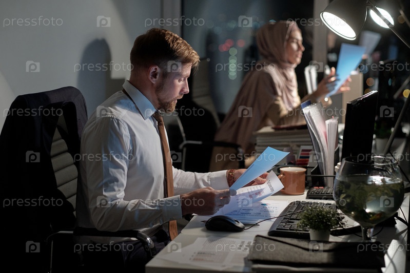 Современный занятый брокер, работающий с финансовыми документами