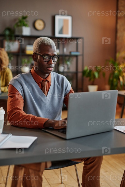 Серьезный бизнесмен, работающий на ноутбуке в офисе